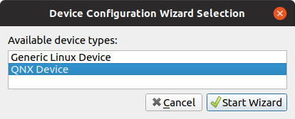 - Select QNX Device, then press Start Wizard.