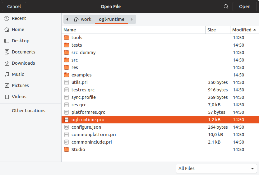 ogl-runtime.proin Qt Creator.ogl-runtime.prois located in the root of the cloned repository.