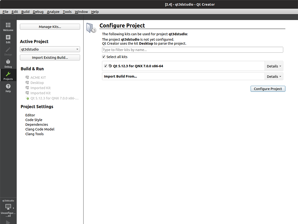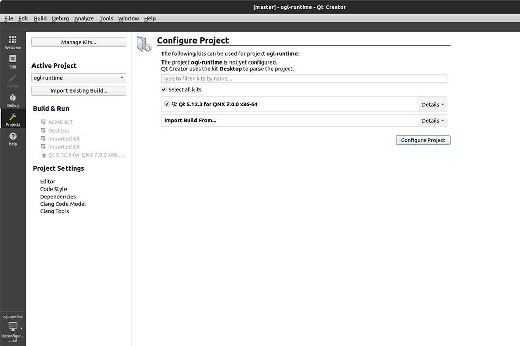 - Select the desired prebuilt QNX component and select Configure Project.