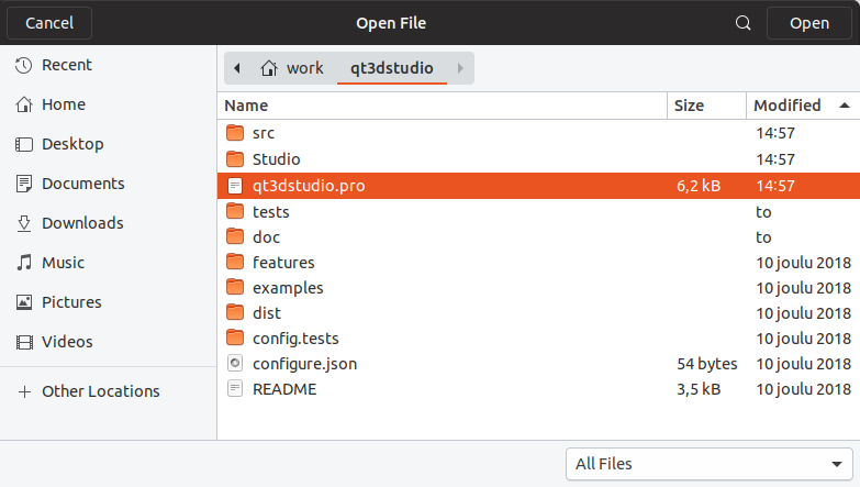 qt3dstudio.proin the Qt Creator.qt3dstudio.prois located in the root of the cloned repository.