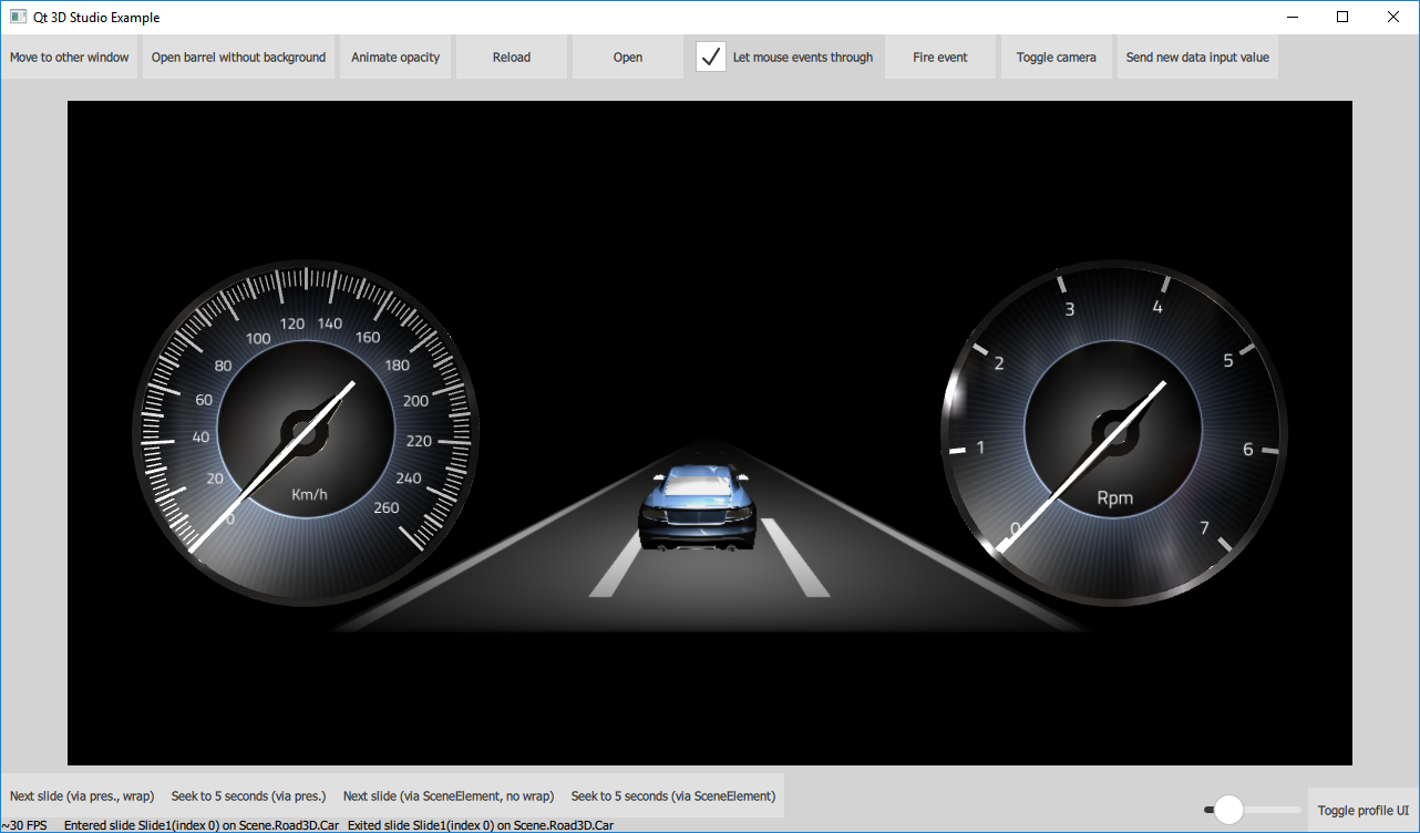 Below is the same scene loaded into a simple Qt Quick application (the simpleqml example) that composes the 3D content with the other Qt Quick items, for example the ones provided by Qt Quick Controls 2. In addition to displaying the presentation, the application can also control many aspects of it (slides, timeline, object properties) and can react on certain conditions, such as when a 3D object is clicked on (picked) by mouse or touch input.