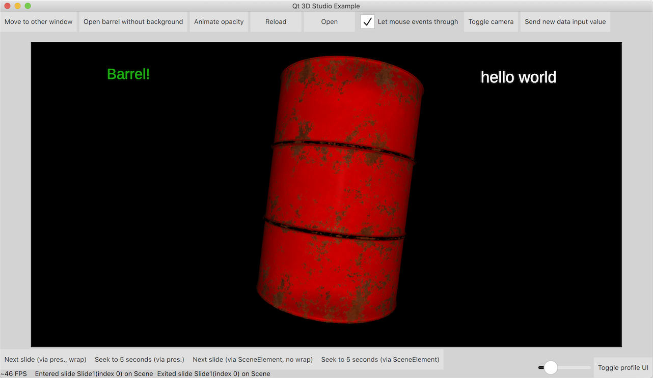 Besides displaying the presentation designed in the Qt 3D Studio application, a few simple cases of interacting with the scene (such as, changing 3D object properties via data input, changing slides, controlling the timeline) are also demonstrated.