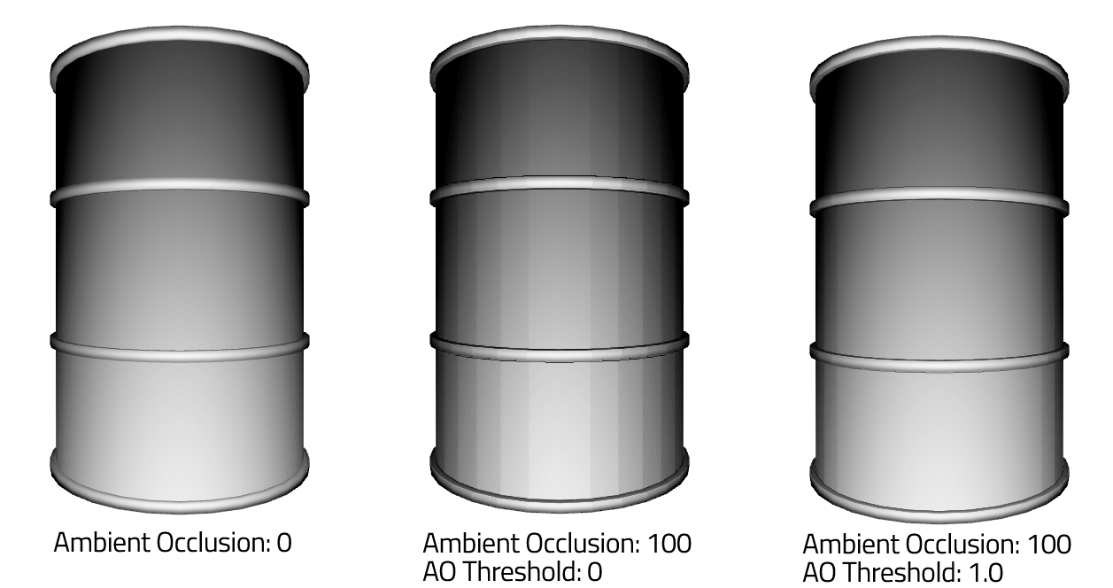 Note: On objects with smooth shading, it is possible that AO makes the faces of an object appear since AO occurs on the original mesh without smooth shading applied. To avoid this, adjusting the AO Threshold value might help. Usually a value between 0.1 and 1.0 will give a good result.