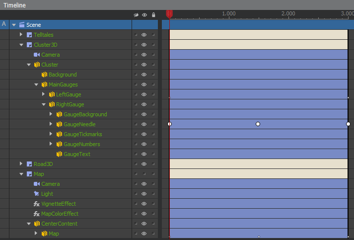 The colored bars displayed for each element control the lifespan during which the element is active. Whenever the playhead (in Studio, or the virtual playhead active at runtime) is outside the time bar for an element, that element becomes inactive: it no longer renders, nor does it receive update events each frame.