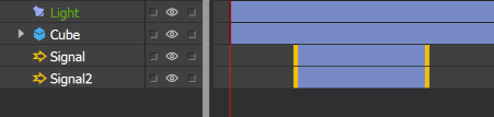 When an object has onActivate or onDeactivate timeline actions on it, those are indicated with markers at the beginning and at the end of the time bar. These actions are usually used with Signal objects.