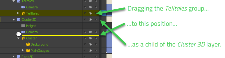 Within each layer is a camera, usually a light, and the elements rendered for the layer. These elements are arranged hierarchically. Placing one element as a child of another causes: