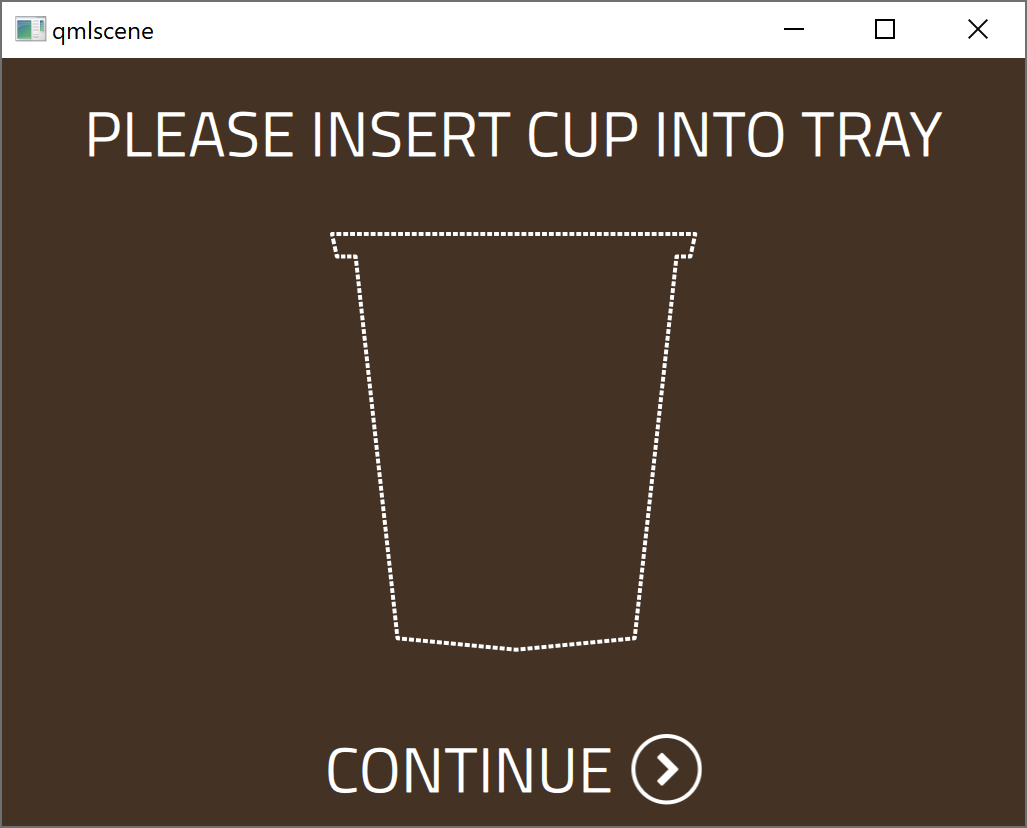 Clicking on Continue triggers the emptyCup.continueButton.onClicked signal handler, which sets the application flow status to "to brewing".