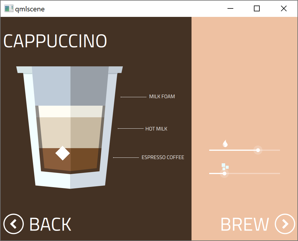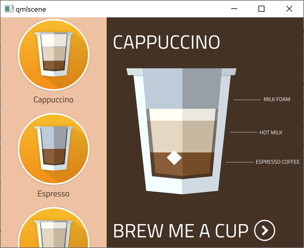 cappuccinoButton.onClicked: { sideBar.currentCoffee = qsTr("Cappuccino") sideBar.currentFoam = 1 sideBar.currentMilk = 7 sideBar.currentCoffeeAmount = 3.5 sideBar.coffeeSelected() }