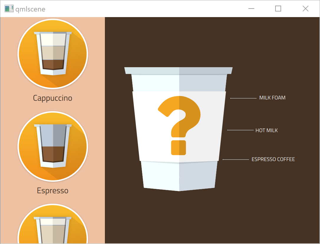 The sideBar.coffeeSelected() signal sets applicationFlow.state in ApplicationFlow.qml to "selection". We will specify the states later.