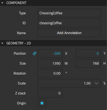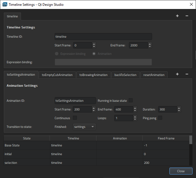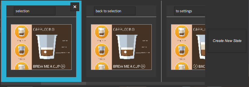 We also create states for animations that are run when moving to the "settings" and "selection" states.