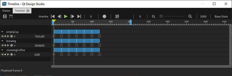 To start recording the transition from the startup screen to the coffee selection screen on the timeline, we select choosingCoffee in Navigator. We check that the playhead is at frame 0, and then select the
