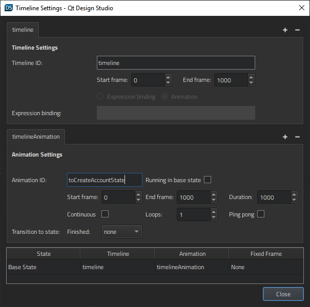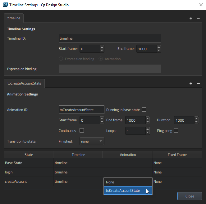 to add a 1000-frame timeline and define settings for running the animation. - In the Animation ID field, enter toCreateAccountState.