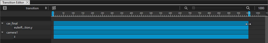 This adds the transition and sets the animation durations to 1 second (1000 ms). By default, all properties that have changed between the states are added to the transition and therefor animated. In this case, the properties are Y rotation for the car model and Z position for the camera.