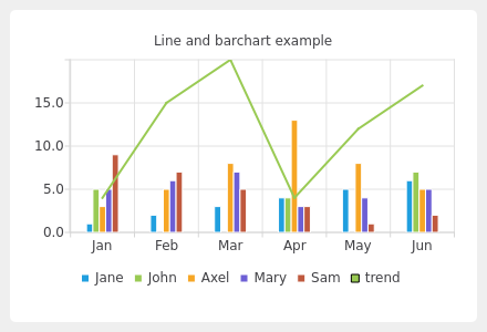 In the example, we combine a linechart with a barchart and use the category axis as a common axis for both.