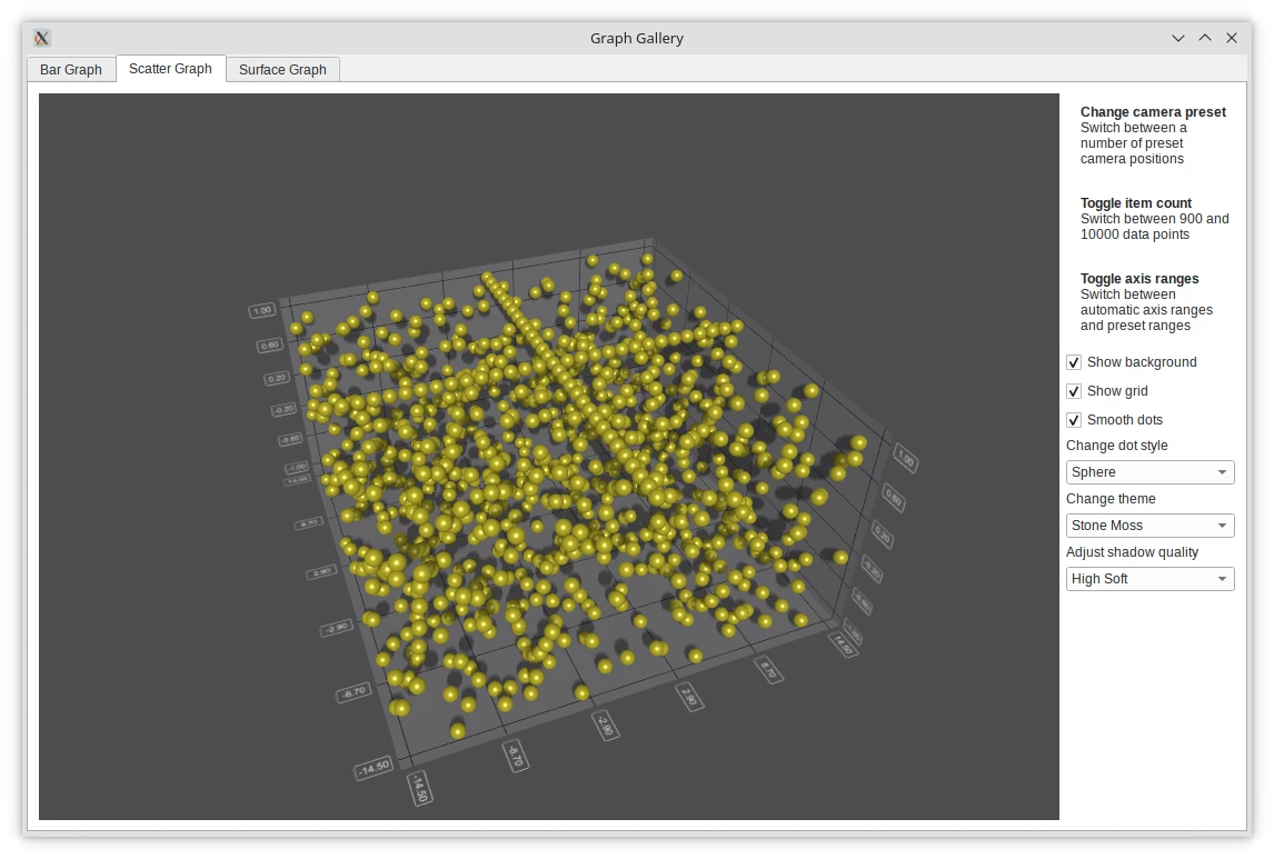 Graph Gallery demonstrates all three graph types and some of their special features. The graphs have their own tabs in the application.