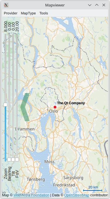 This is a large example covering many basic uses of maps, positioning, and navigation services in Qt Location.