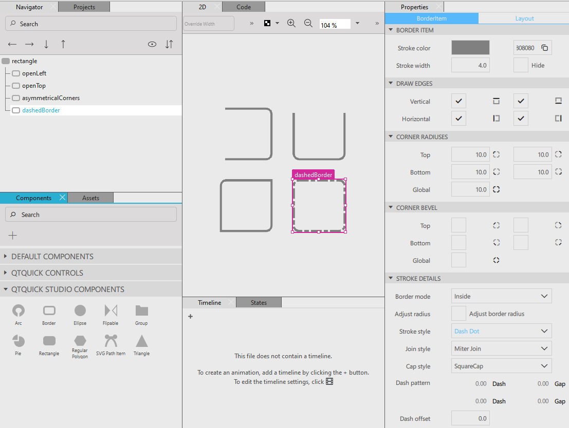 You can use the Border component in Qt Design Studio to create different kinds of borders.