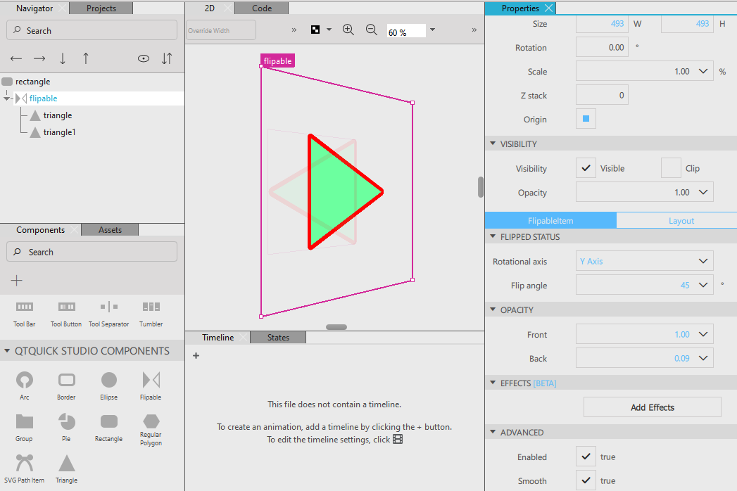 FlipableItem { id: flipable x: 595 y: 277 width: 493 height: 493 opacityFront: 1 opacityBack: 0.09412 flipAngle: 45 rotationalAxis: 1 TriangleItem { id: triangle x: 122 y: 122 width: 250 height: 250 opacity: 1 z: 0 strokeWidth: 10 fillColor: "#6cff9f" rotation: -270 } TriangleItem { id: triangle1 x: 16 y: 122 width: 250 height: 250 strokeWidth: 10 rotation: 270 fillColor: "#6cff9f" } }