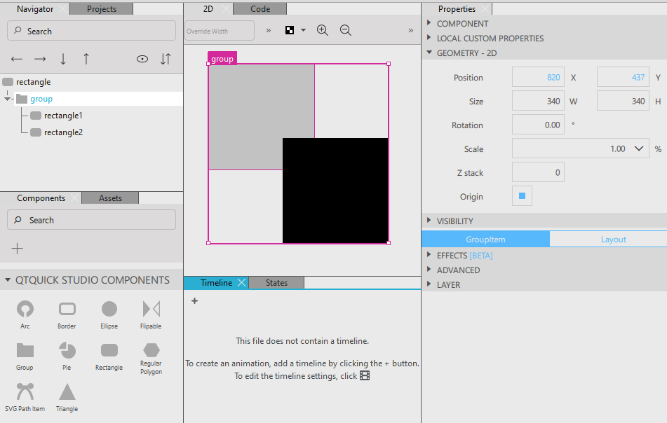 The Group type is an Item type extended with the size property. The value of size is automatically calculated to fit the children of the group.