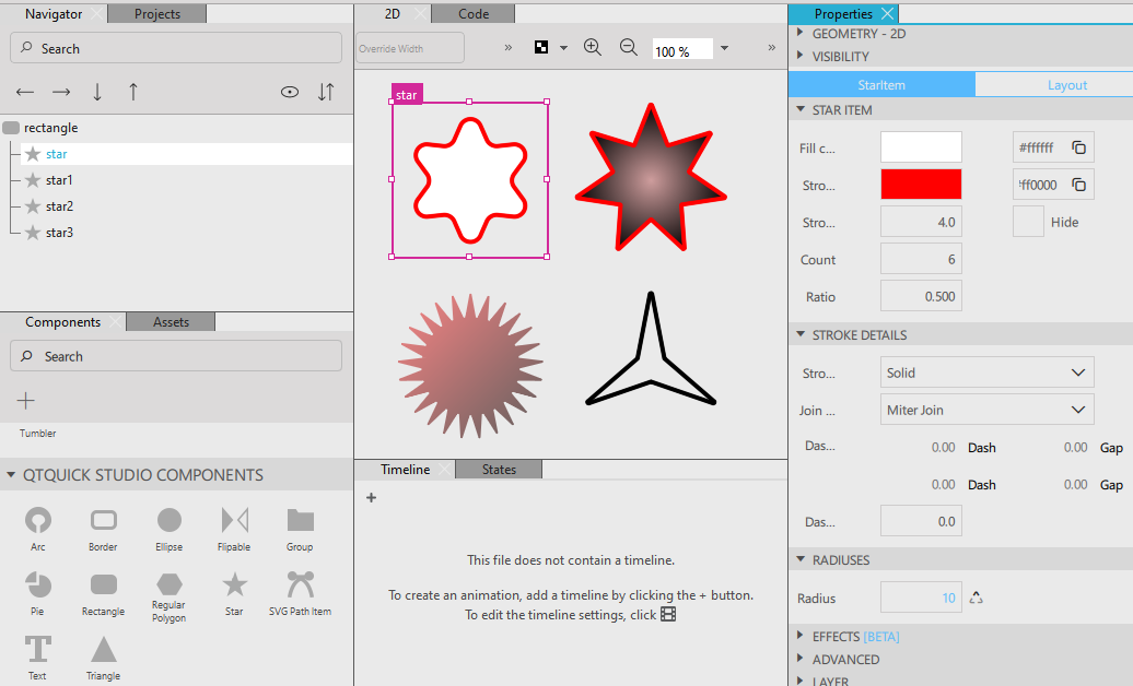 Note: The width of the star's border does not affect the geometry of the star itself or its position relative to other items if anchors are used.