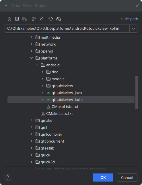Test your development setup by running the examples shipped with the Qt installation. You'll need to know your Qt folder path first. When using the Qt Online Installer, the default install locations for the Qt folder are: