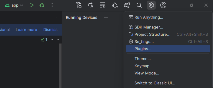 - On top-right corner select Settings(gear-icon)->Install Plugins From Disk.