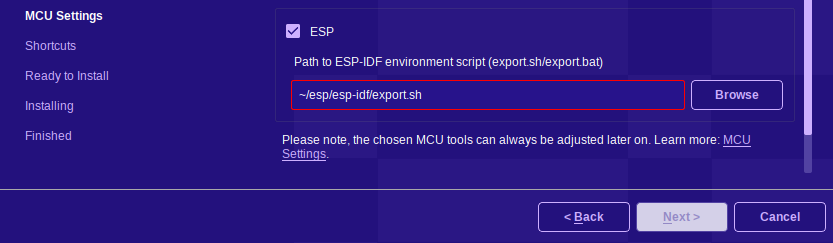 After installing the ESP-IDF toolchain, you should have a batch file or shell script which sets up the development environment. You can provide Squish for MCU the path to that script here.