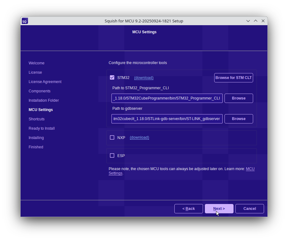 Before installing Squish for MCU, you should first install Qt for MCUs version 2.8.1 or later. Install the Common Files as well as the package which is specific to your Microcontroller Unit (MCU).
