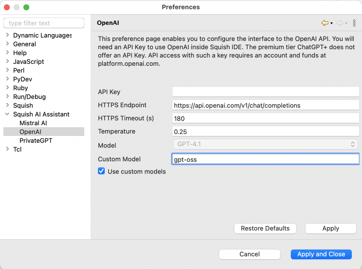In order to use the Squish AI Assistant it is necessary to configure which Large Language Model (LLM) it should connect to. This is done through the Preferences dialog. Select Edit > Preferences to open the dialog.