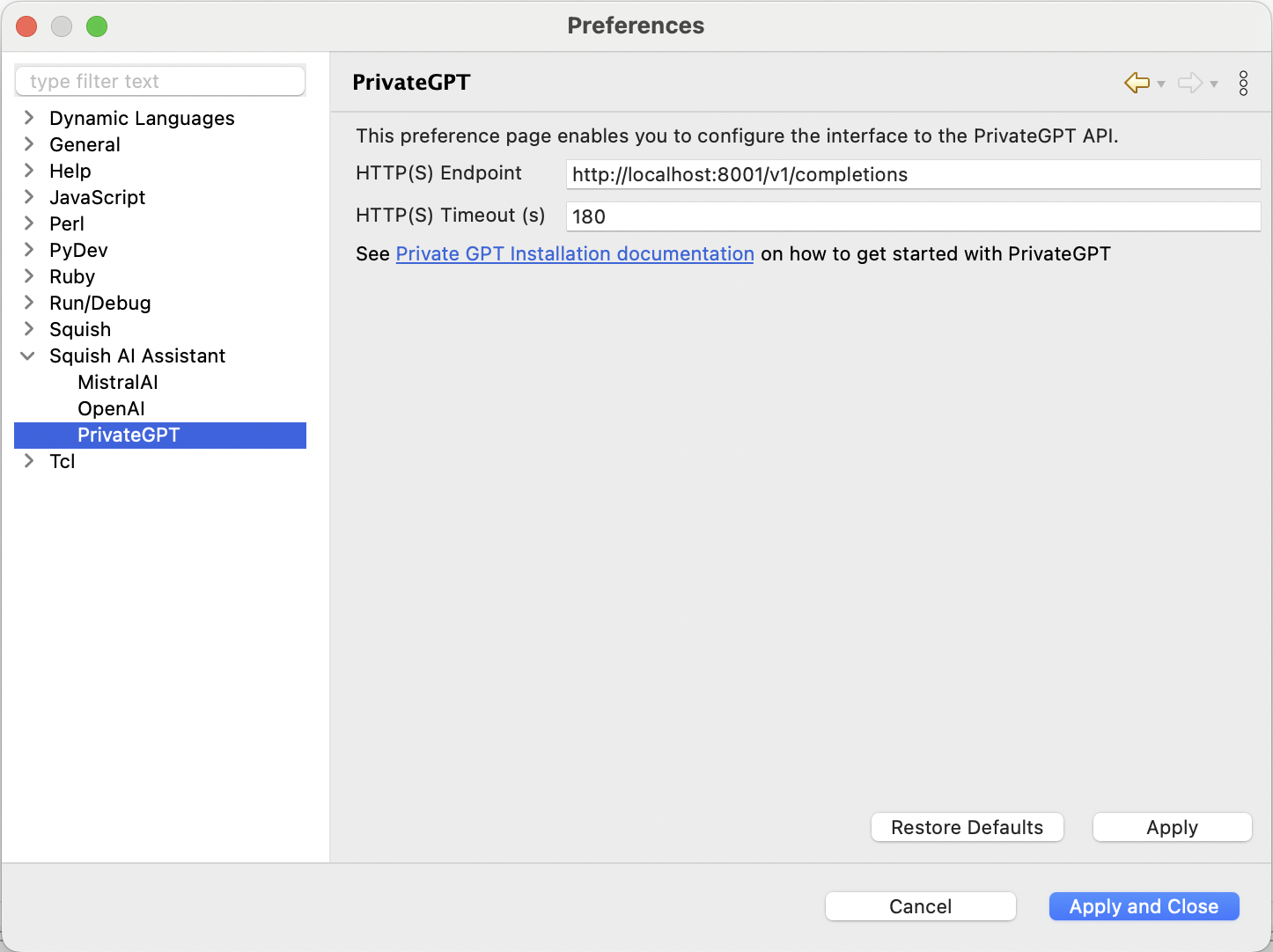 Once you have an endpoint available where PrivateGPT runs put the endpoint url into the HTTP(S) Endpoint field. You can leave the other fields at their defaults.