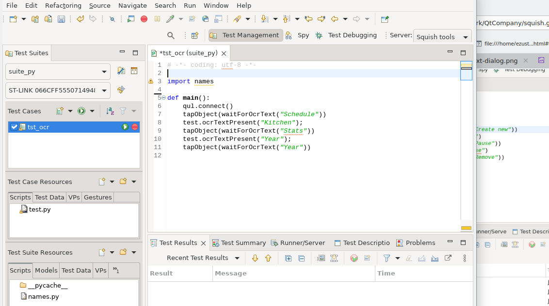 }If the recorded test doesn't appear, click (or double-click depending on your platform and settings) the tst_ocr test case; this will make Squish show the test script in an editor window as shown in the screenshot.