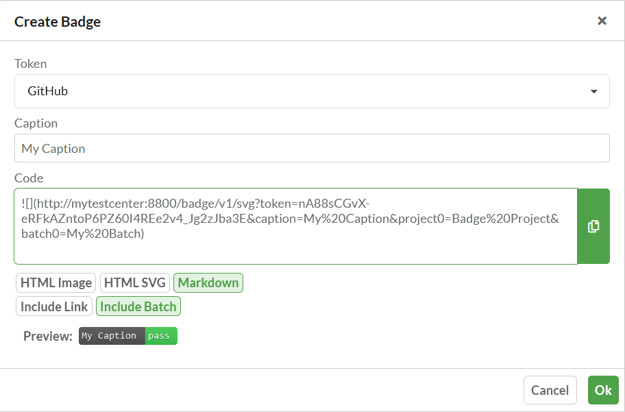 A dialog is shown to configure the code snippet, which can be embedded in external tools. The Include Link option determines whether the snippet also contains a link to the result in Test Center. The Include Batch option determines whether the result badge should always refer to the newest uploaded result, or to a specific Batch. You can also configure whether you want to embed the link in a Markdown or HTML document. Once you are satisfied with the selected options, you can copy the content of the Code field and use it to display the badge similar to the one previewed.
