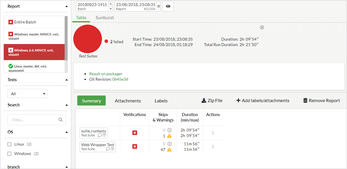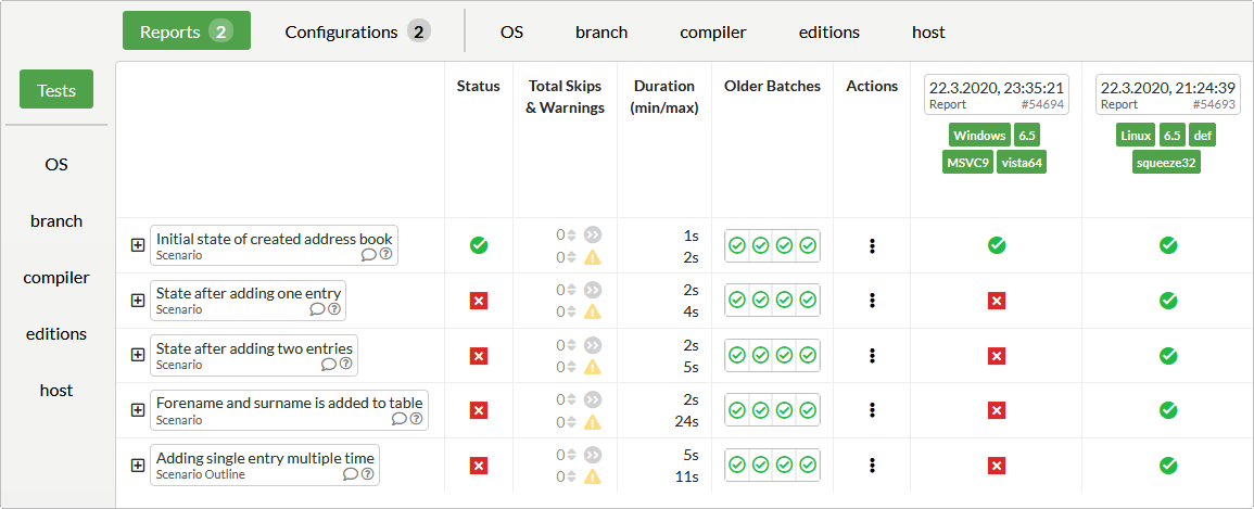 • Following columns will show the results of each uploaded report for this batch. In the header the execution date, as well its labels, of the report are shown. If a .reference.url label was set it will also be rendered with the title and a link as specified in How to Upload results.