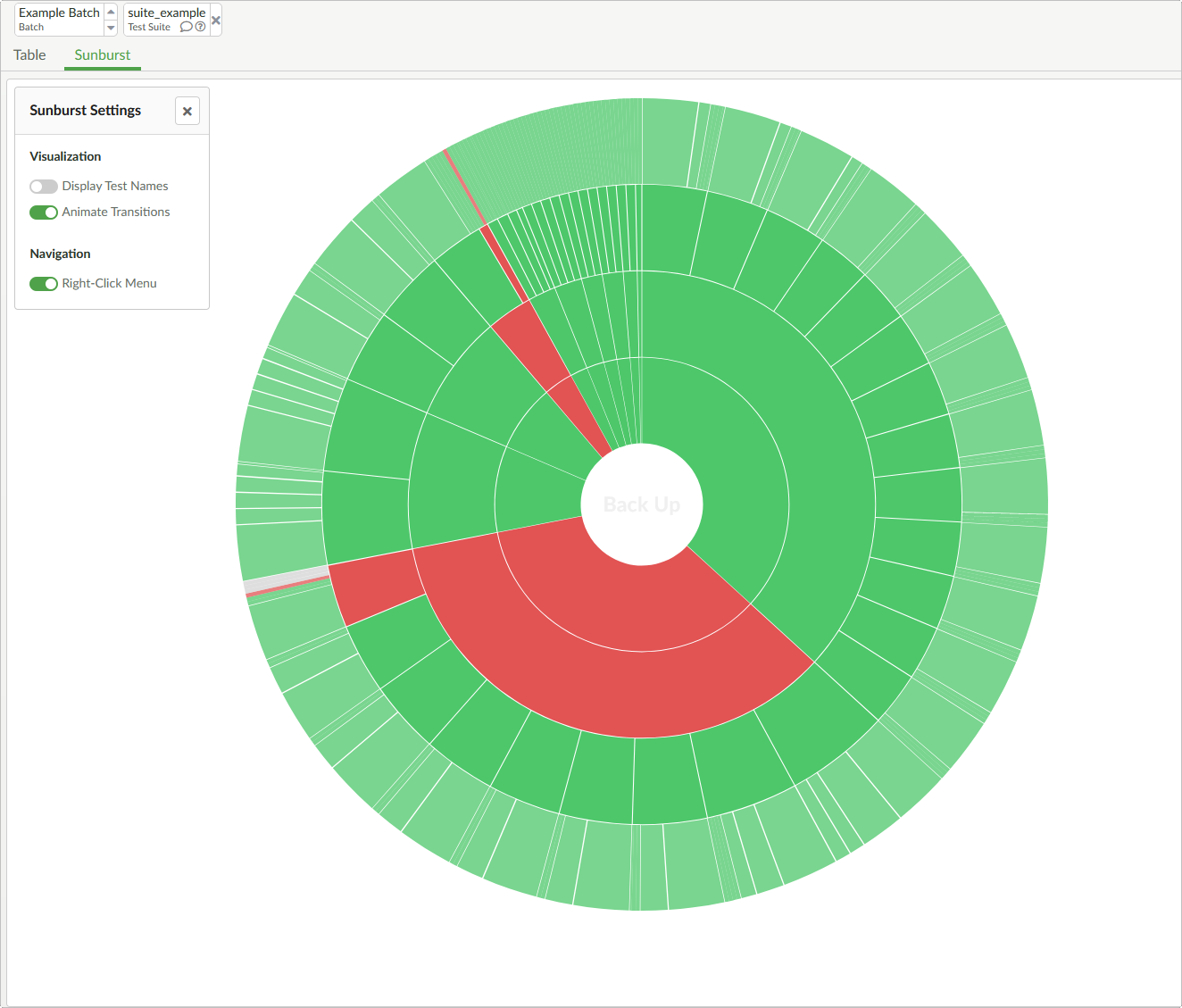 • Display Test Names shows and hides test item names on the diagram slices. Since the space within the sunburst slices is very limited, the text has to be truncated by default. Since the test names are also visible in the tooltips, you can hide the names to achieve a cleaner look.