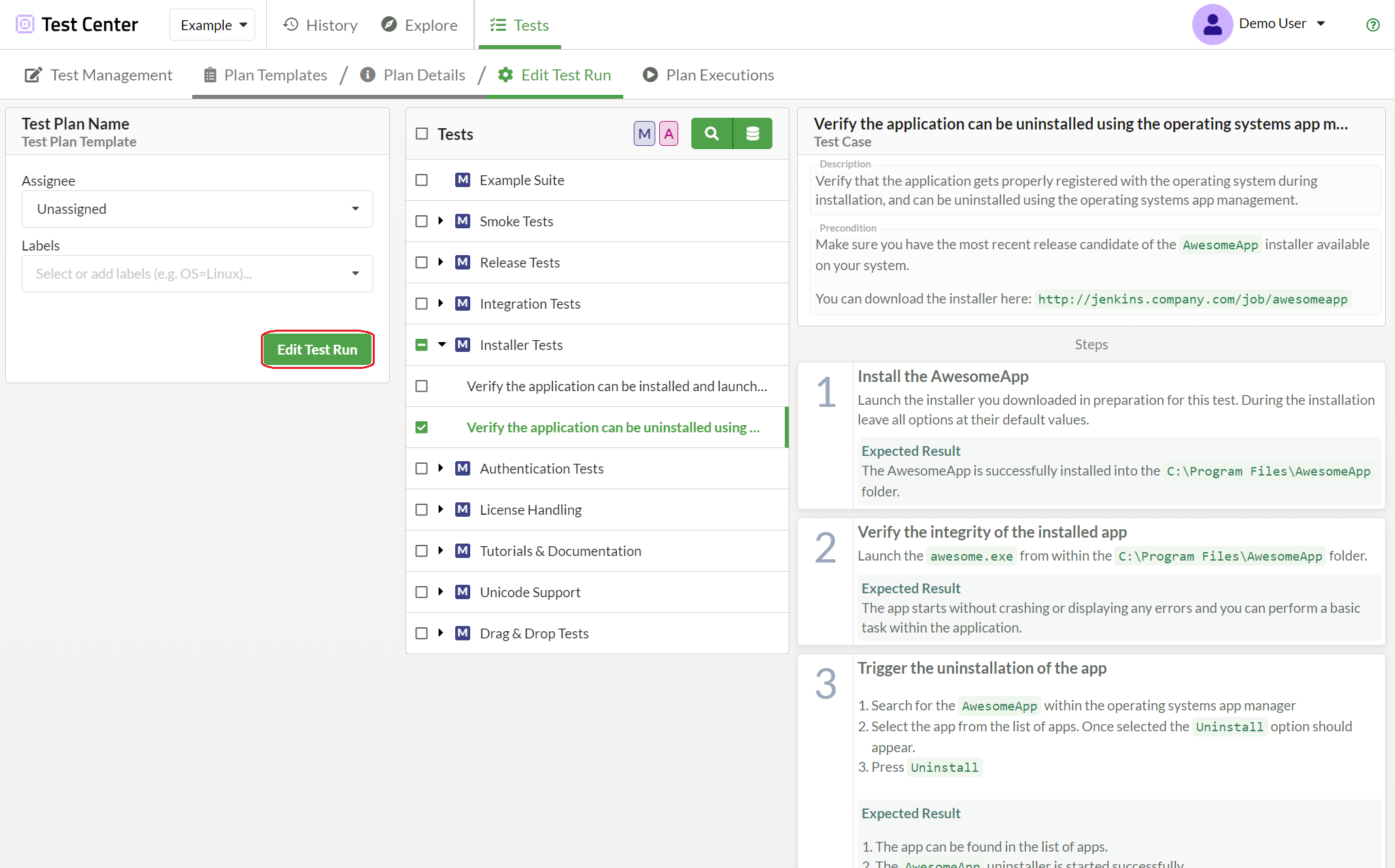 Edit Test Run view