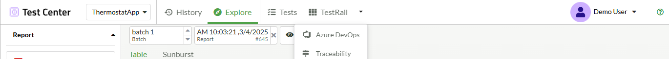 If you have set up and activated an integration between Test Center and a 3rd-party tool, it appears in a list of integrations in the Explore and History views after you enable integrations in the Global Settings view. Select an integration in the list to open the Traceability view for it.
