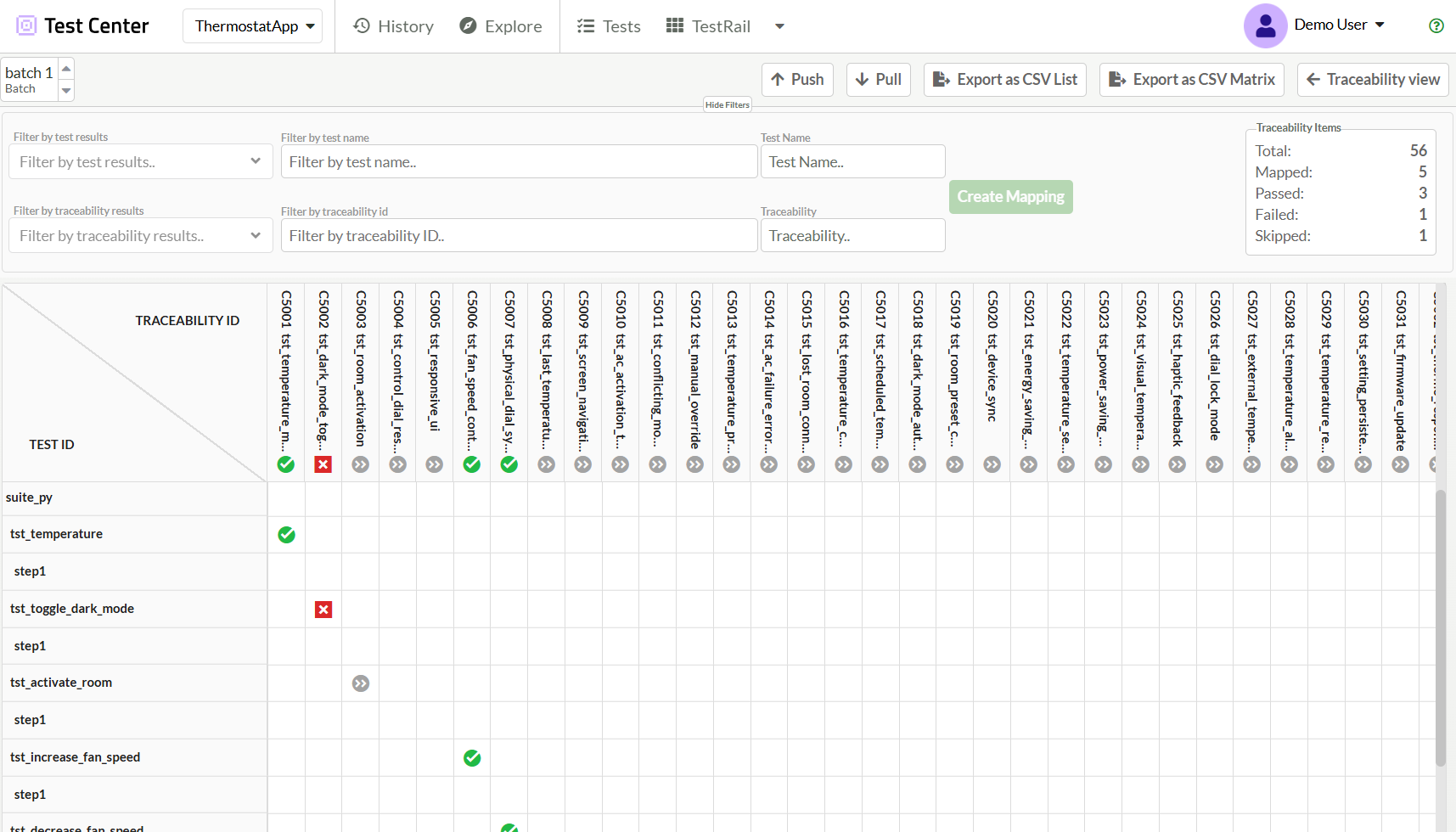 And then to create or remove a mapping, either double-click the intersecting cell or press the Create Mapping button. After that, the matrix will update the cell with the corresponding test result.