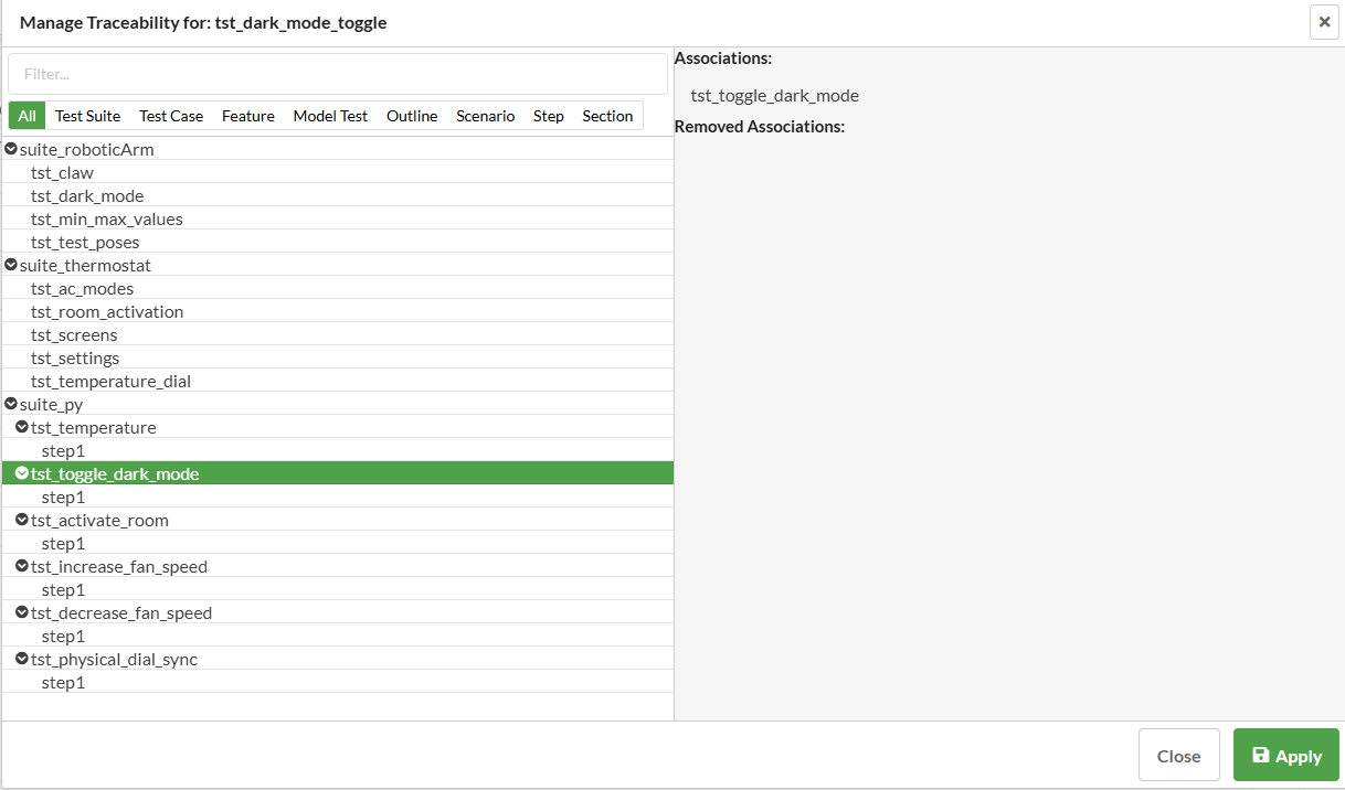 To map an integration item to Test Center tests, click the Edit button next to the item in the Mapping column. A popup opens in which you can associate Test Center tests by selecting them. You can also select multiple tests from the project you are currently viewing. Click a test in Associations to remove/disassociate it. Click Apply to save the current mapping.