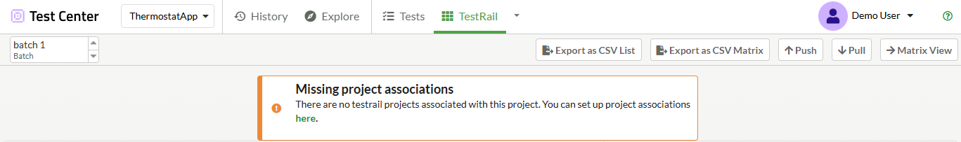 If you haven't fetched external projects or mapped them to Test Center projects, the Traceability view and the Matrix view display a warning that leads to the Global Settings view for this integration.