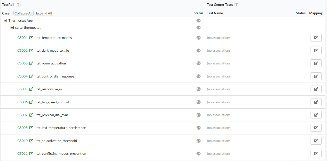 In this view, the traceability table will contain items from the external system in the left side and associated Test Center tests in the Test Center Tests column. The status of each external item shown on the left is an accumulation of the results of each of the associated tests that were executed in the currently selected batch. Right now there are no associations made, so the table will look relatively uninteresting.