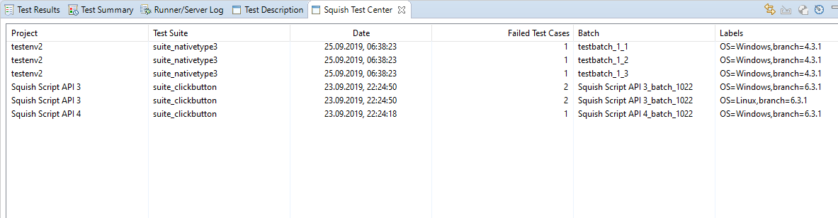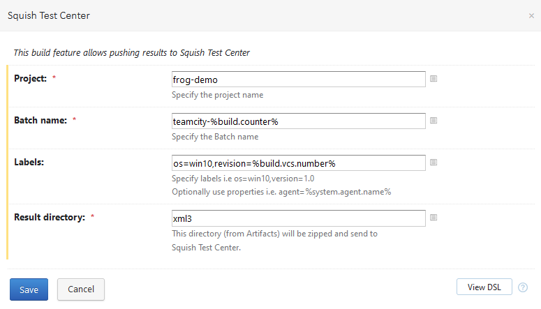 - Provide Test Center Project name, Batch name, Labels, and Result directory. If Squish results are being sent and Squish plugin is used to run tests, enter xml3 in Result directory.