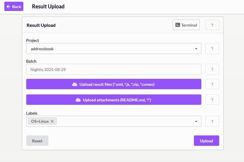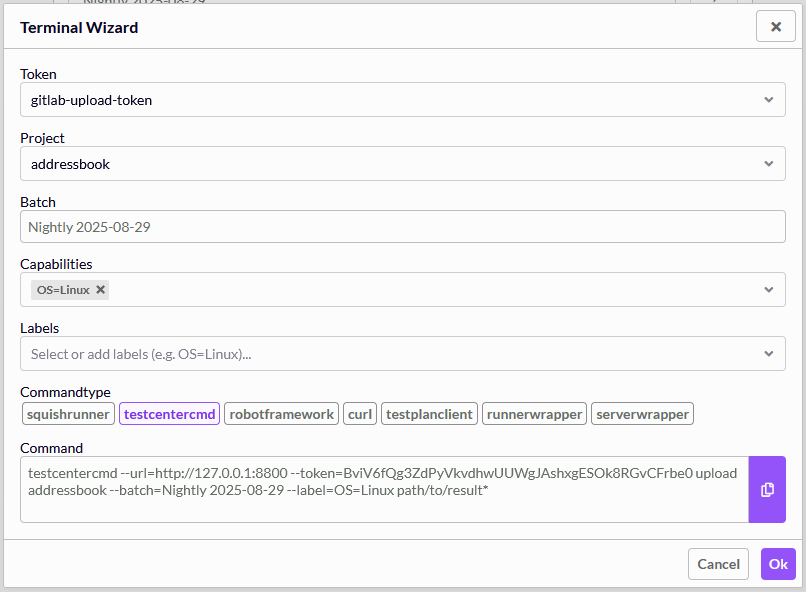 You can upload results to Test Center on the command line by using testcentercmd, squishrunner or curl. A simple way to generate the comamnd line arguments that we document in the following sections is using the Terminal Dialog that you can find on the result upload page.