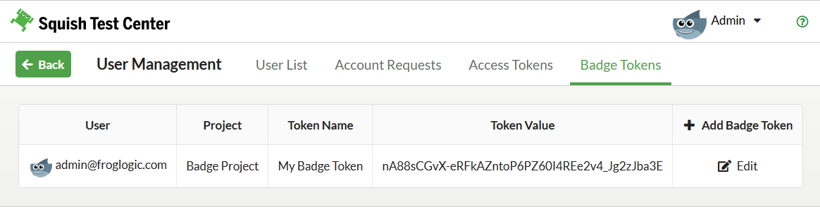 Administrators can create and manage badge tokens in User Management > Badge Tokens.