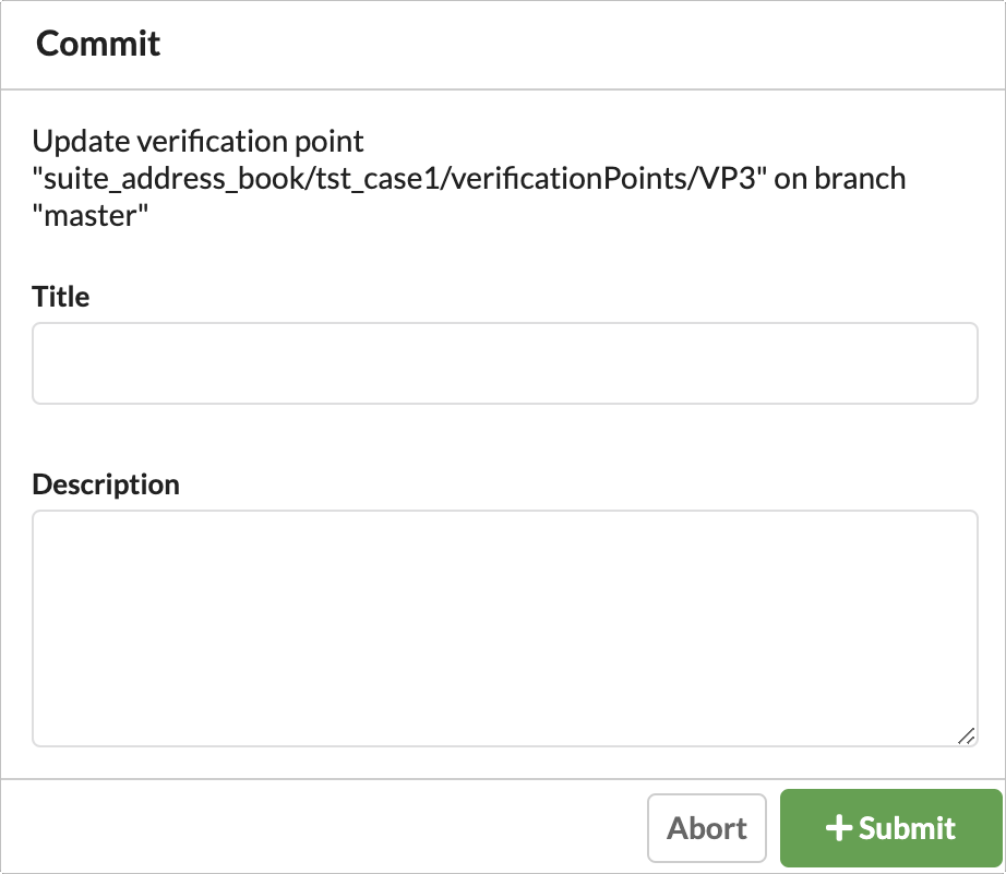 The updated verification point file is committed to the default branch specified in the Git repository settings or the head of the branch specified by the .git.branch label. If the verification point file was already updated by another user or at a previous point in time, the Submit button is disabled and an info message is displayed.