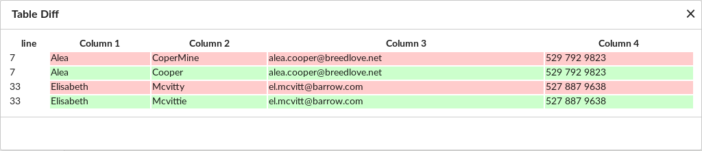 Clicking the camera icon for a table comparison failure shows a simple row-by-row difference. Green rows replace the pink expected rows of the table verification point.