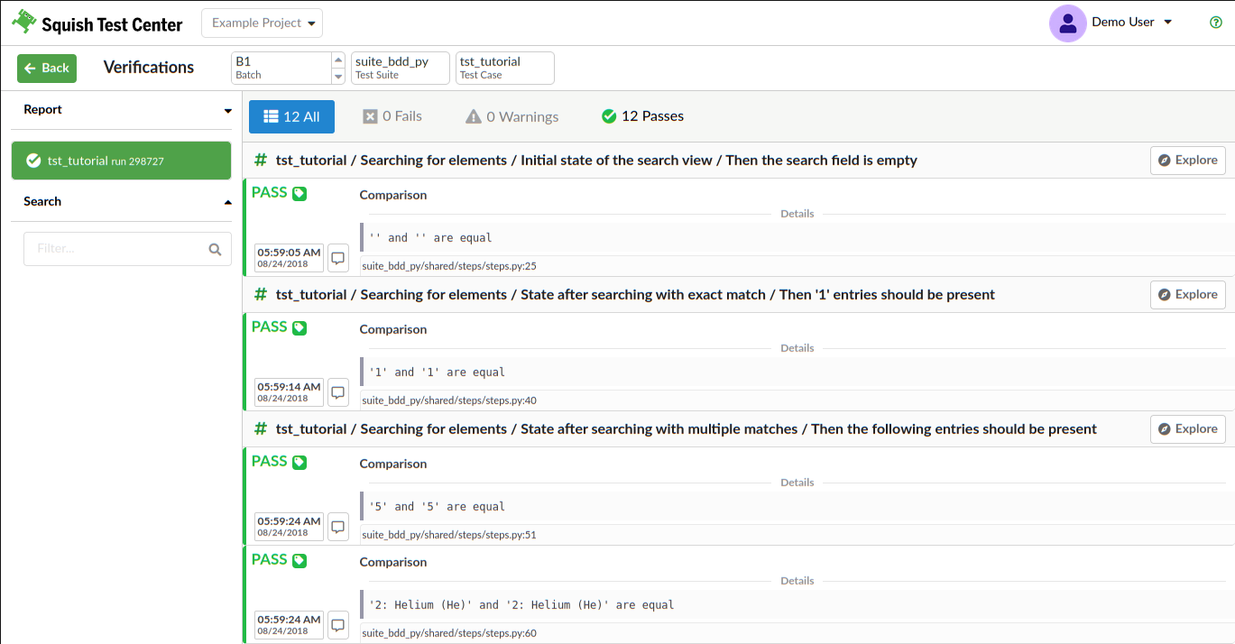 Click the Test Suite breadcrumb button to show verifications for each test case of the suite. Click the Batch breadcrumb button to show all the test suite runs of that batch.