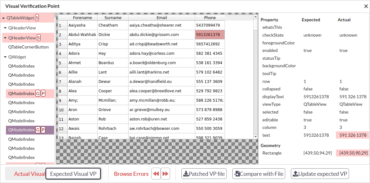With a visual verification point (VVP) failure during a Squish test run, a dump of the application actual user interface (UI) is saved in the results. As mentioned, the camera icon represents the link to the failed VVP results. Right-click the result file to save it for later viewing with the Squish uibrowser or visualvpeditor utilities. To show this dump in Test Center, click the camera icon. This opens the Visual Verification Point dialog.